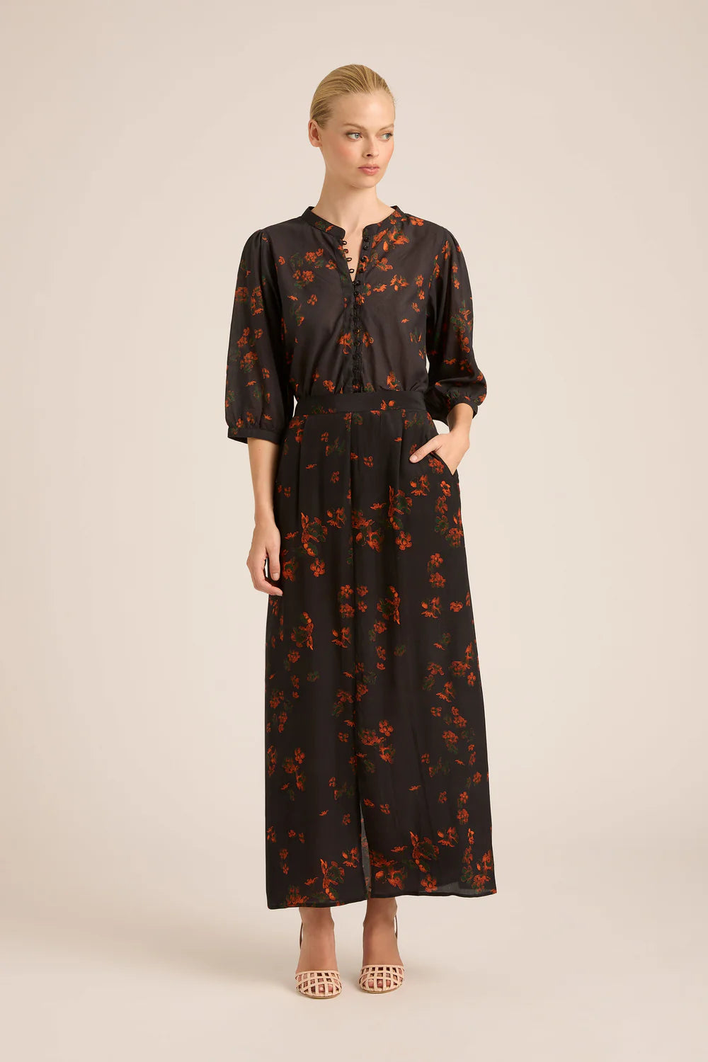 A timeless blend of elegance and comfort to elevate your style. This exquisite dress features extended sleeves, a button-neck to hem closure, and elasticated cuffs for a secure and comfortable fit, perfect for any occasion.